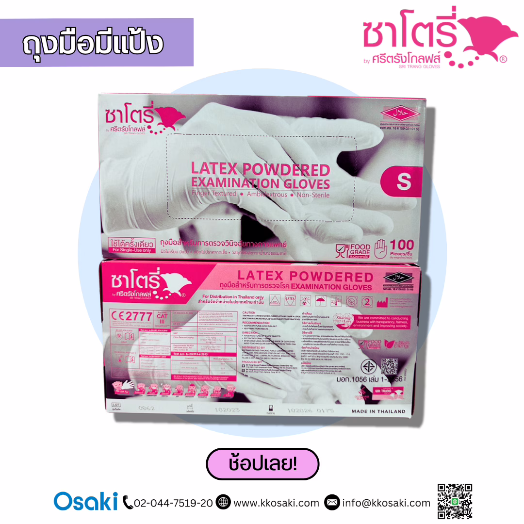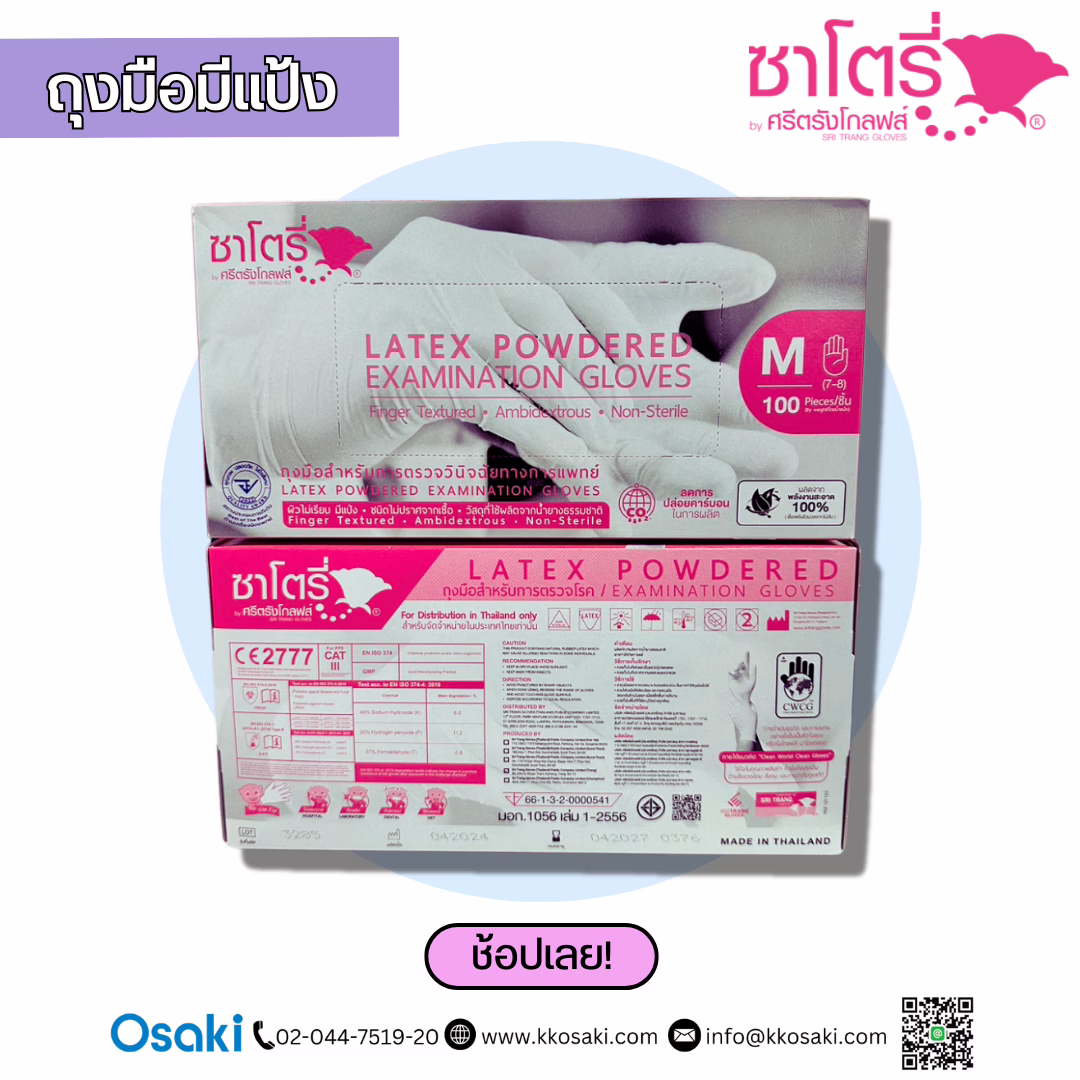 ถุงมือยาง ธรรมชาติ แบบมีแป้ง กล่องชมพู ถุงมือซาโตรี่ ศรีตรังโกลฟส์